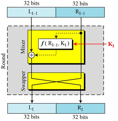 라운드 함수의 경우는 이전 라운드 함수 출력값 LI-1과 RI-1을 입력으로 받아, 다음 라운드에 입력으로 적용될 L1 R1을 생성한다. 각 라운드는 2개의 암호 요소 혼합기(mixer)와 스와퍼(swapper)가 있다. 이런 요소들은 역연산이 가능하다. 스와퍼는 명백하게 역연산이 가능하다. 왜냐하면 스와퍼는 단순히 텍스트의 오른쪽 절반을 가지고 텍스트의 왼쪽 절반과 교환하기 때문이다. 혼합기는 단순히 XOR연산이기 때문에 역연산이 가능하다. 그 외 모든 비가역 요소들은 함수 f(RI-1, KI) 안에 모여 있다.